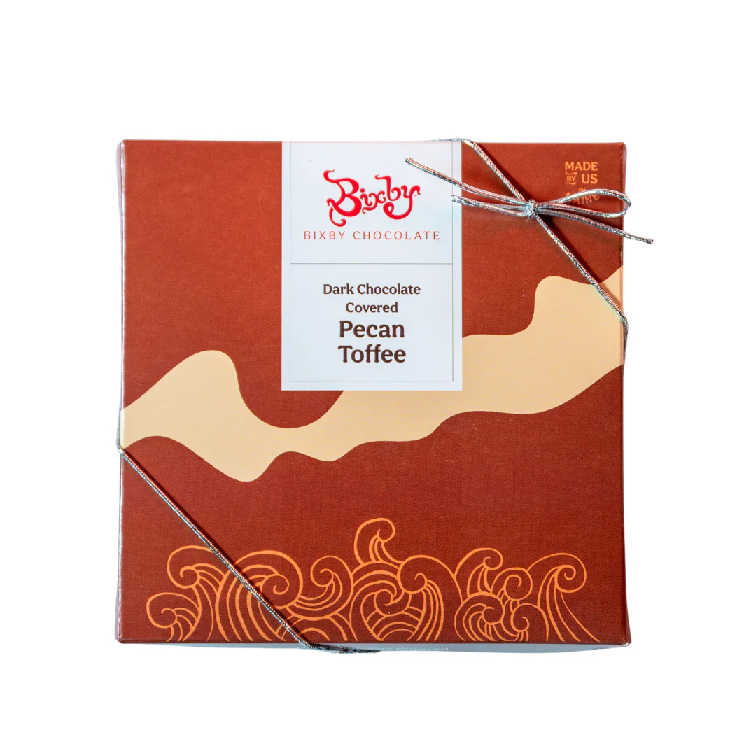 The toffee itself is where we start: cooked just to that precise moment where butter and sugar transform into something magical—crisp but not tooth-breaking, rich but not cloying. Then we coat each piece in dark chocolate that adds depth without overwhelming the toffee's buttery character. The sea salt version gets a sprinkle of flaky Maine sea salt that amplifies every flavor. The pecan version gets generous pieces of toasted pecans for crunch and nutty warmth.